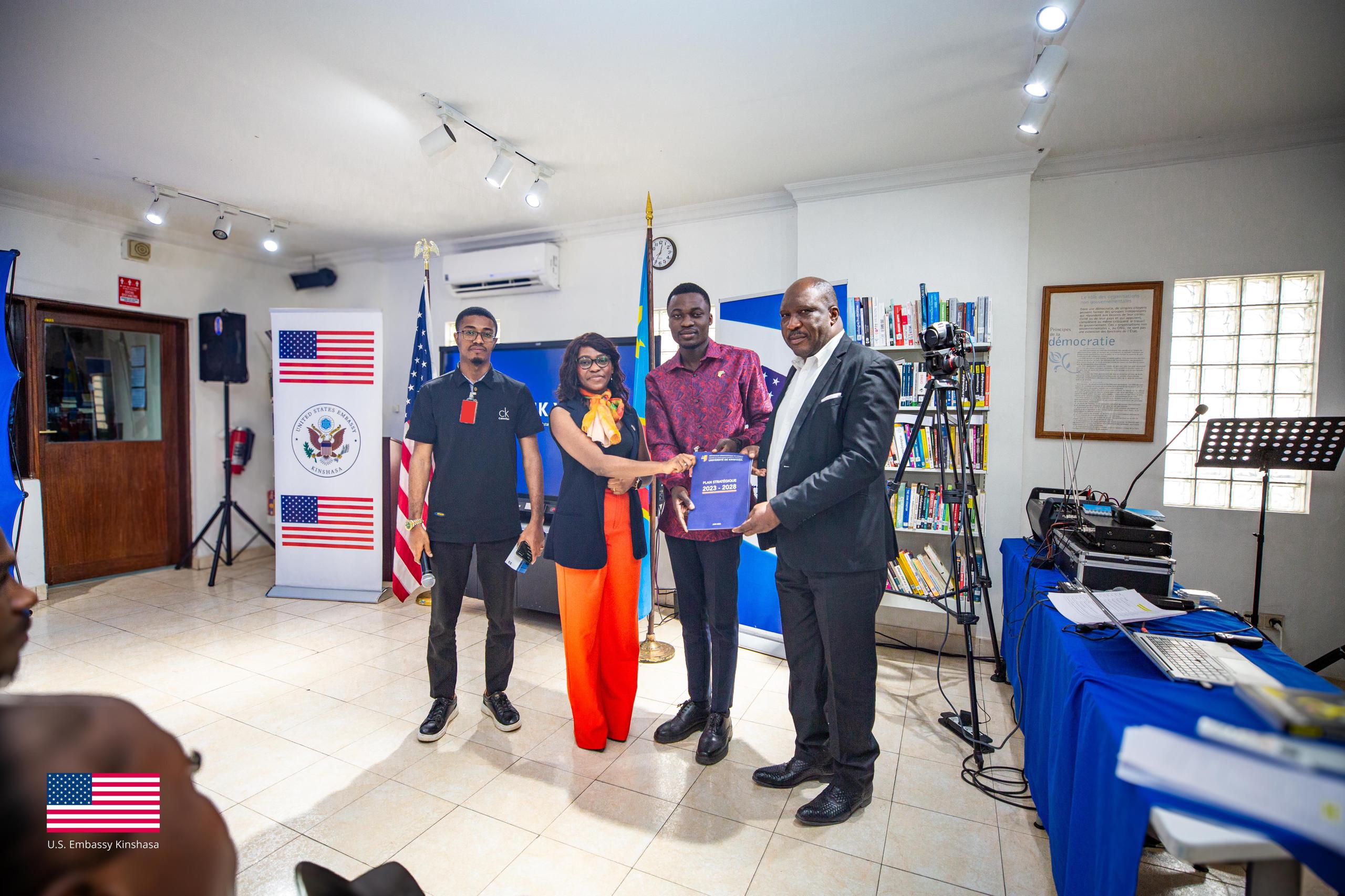 La délégation était conduite par Monsieur Jérémie KUNIMA, Assistant chargé de la Presse et de la Communication du Rectorat, représentant le Recteur Jean-Marie KAYEMBE NTUMBA. Dans son discours, il a plaidé pour l’installation d’un espace culturel américain au sein de l’Université de Kinshasa, afin de permettre aux étudiants de postuler aux programmes offerts par les États-Unis et de s’imprégner de la culture américaine.