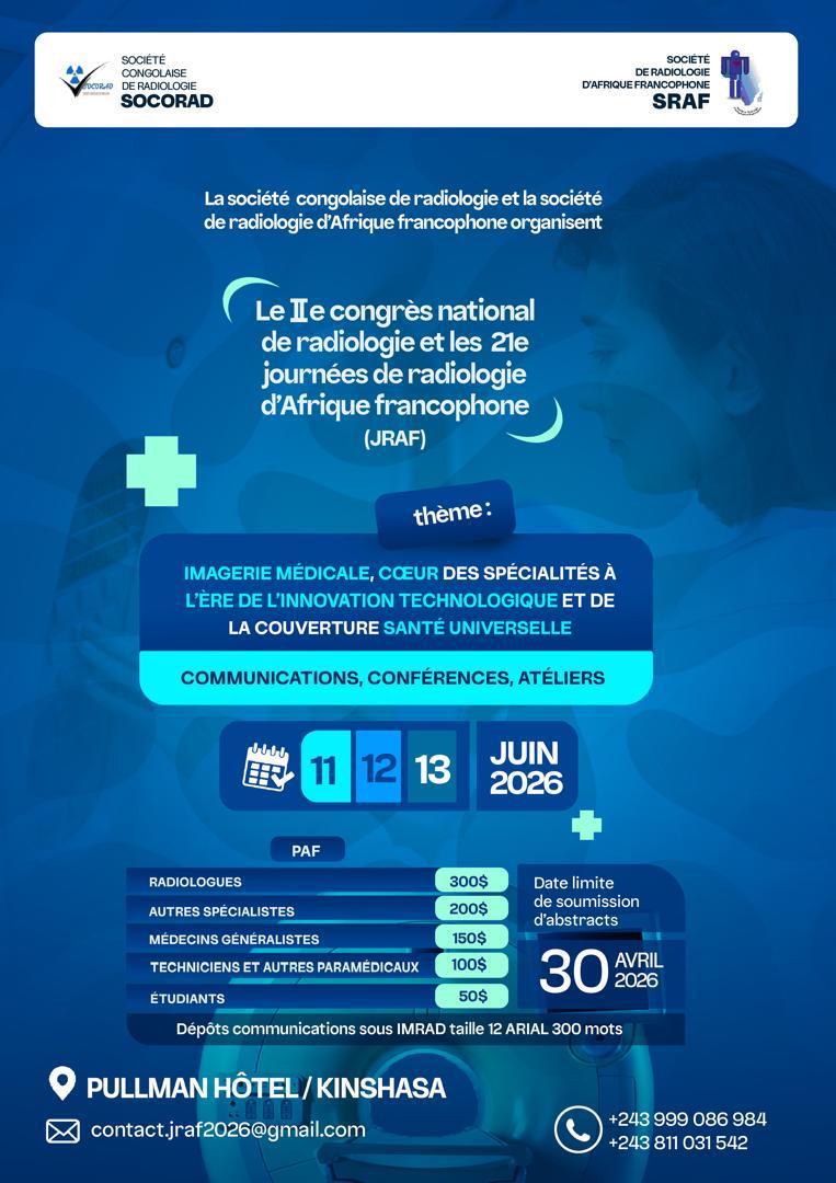 La Société Congolaise de Radiologie (SOCORAD) et la Société de Radiologie d'Afrique Francophone(SRAF) annoncent la tenue d’un événement scientifique majeur à Kinshasa, du 11 au 13 juin 2026.