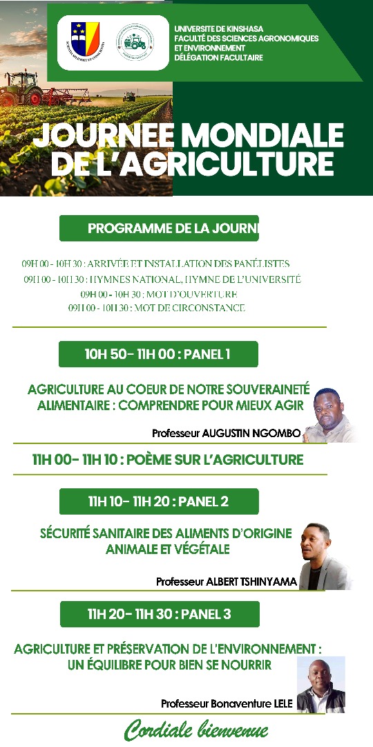 La Faculté des Sciences Agronomiques et Environnement, à travers sa Délégation facultaire, organise une activité dédiée à la Journée mondiale de l’Agriculture à l’Université de Kinshasa, autour du thème : « Mieux comprendre l’agriculture pour mieux consommer ». L’événement se tiendra à la Salle MANEKOSO (Réf. Cliniques Universitaires), à Kinshasa, de 09h00 à 12h30, sous le haut patronage du Professeur Jean-Marie Kayembe, Recteur de l’UNIKIN, avec le parrainage de Son Excellence Madame la Ministre de l’Enseignement Supérieur, Recherches Scientifiques et Innovations.