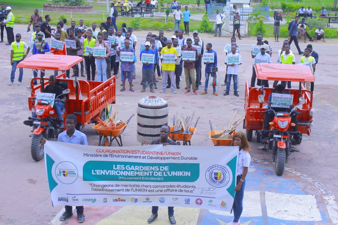 Lancement du mouvement « Les gardiens de l’environnement » par le Recteur de l’Université de Kinshasa, le Professeur Jean-Marie Kayembe Ntumba. Des tricycles et autres matériels d’assainissement ont été remis aux défenseurs de l’environnement et de l’hygiène universitaire à cette occasion.