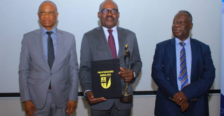 Pour ses nombreuses réalisations en faveur de la communauté universitaire, le Ministre des Finances, Nicolas KAZADI reçoit un prix d’Excellence, lui octroyé par l’Université de Kinshasa ce jeudi 30 novembre 2023. Cette cérémonie présidée par le Recteur Jean-Marie KAYEMBE NTUMBA, accompagné du Secrétaire Général Administratif, le Professeur Bruno LAPIKA et du Vice-Doyen chargé de l’Enseignement de la Faculté des Sciences Économiques et de Gestion, le Professeur MABIKA MABIKA, a eu lieu dans la Salle Monekosso de cet établissement universitaire en présence des Doyens des Facultés, des Directeurs des entités décentralisées, du Personnel administratif et des étudiants.