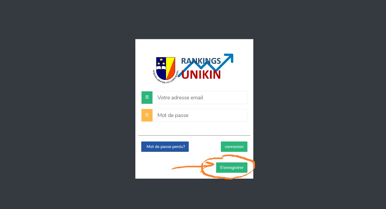 Le Secrétariat Général en Charge de la Recherche de l'Université de Kinshasa mets à la disposition de la communauté de chercheurs, une application pour permettre l'envoie et la réception de livrables. Comment faire ? Aller sur le lien que nous vous indiquerons en bas de cette page Crée votre compte dans l'application Un fois cliquer sur le lien, vous serait rediriger vers cette page (Voir figure 1) Figure 1 : Page de connexion Si c'est une première fois, veuillez cliquer sur le bouton s'enregistrer pour vous permettre de crée votre compte dans la plate-forme. page d'enregistrement Figure 2 - Page qui permet de crée votre compte dans l'application de Ranking Interne de l'Unikin Figure 2 : 1 - Mettre votre nom 2 - Mettre votre adresse email 3 - Mettre un mot de passe (selon votre convenance) 4 - Confirmer le mot de passe (réécrire le mot de passe) 5 - Choisir l'entité dont vous appartenez 6 - Cliquer sur s'enregistre Un fois cela fait vous aurez un message de confirmation, qui vous vous demanderez de vous connecter de l'application après votre enregistrement dans la plate-forme. Et ainsi, vous serez rediriger vers la page de connexion (Voir Figure 1). Là, mettez votre email et le mot de passe inscrits, et cliquer sur le bouton "connexion" qui vous affichera Figure 3 : Tableau de bord Les rubriques à remplir sont à votre gauche, il suffit de cliquer sur une pour afficher le formulaire. La première rubrique à remplir est "Authentification" (Important) N.B : L'application marche en session, c'est à dire après un certains moment d'inactivité, elle se déconnecte, si vous constater cela reconnectez vous simplement, et si aussi vous remarquer que rien ne se fait, veuillez cliquer sur la rubrique quitter dans le menu à gauche pour permettre votre connexion. A CONSIDERER : Si à l'en-tête, vous ne voyez pas votre adresse email, sachez que vous êtes déconnectés à cause de l'inactivité Aller dans l'application