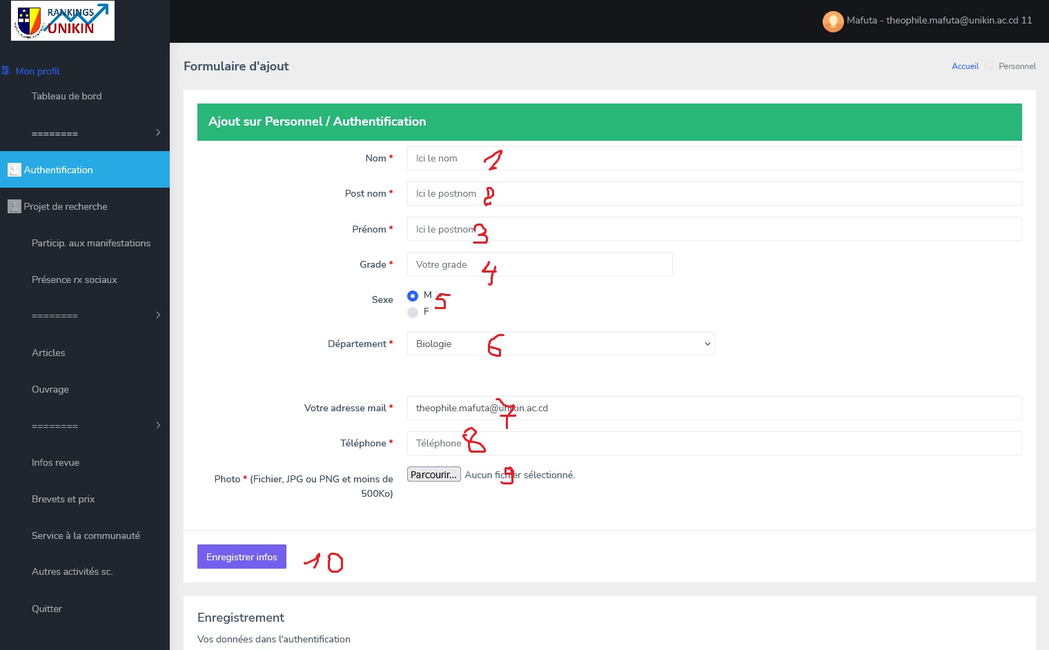 Exemple 1 : Rubrique AUTHENTIFICATION Figure 4 : Rubrique Authentification Simplement, 1- Votre nom 2- Votre Postnom 3- Votre Prénom 4- Votre grade 5- Choisir le genre 6- Choisissez sur une liste votre département 7- Votre adresse email (par défaut, l'application affiche celle introduit lors de votre enregistrement) 8- Mettez votre numéro de téléphone 9- Choisissez votre photo (Photo de profil, possibilité que cela soit affichez sur le siteweb de l'unikin), veuillez respecter le format et la taille SVP. 10- Cliquer sur enregistrer A chaque fois que vous cliquer su enregistrer, l'application vous affiche en retour, plus souvent un peu en bas les info que vous avez fournis. Exemple 2 : Rubrique ARTICLE Cliquer sur la rubrique article, toujours à votre gauche. Une fois fait, vous aurez la page ci-dessous Figure 5 : Rubrique article 1- Mettre le titre de votre article -> Choisir si vous êtes auteur ou co-auteur 2- Mettre le nom de la revue 3- Indiquer la date de la publication 4- Indiquer le volume de l'article 5- Indiquer le numéro de l'article 6- Indiquer la plage du numéro d'article 7- Mettre le DOI (si cela existe) 8- Mettre l'ISSN de la revue 9- Indiquer le lien web de l'article 10- Cliquer sur le bouton Après quoi vous verrez vous informations s'afficher sur le tableau en bas, comme le montre le figure 5 Pour assistance, WhatsApp Uniquement : +243850444733